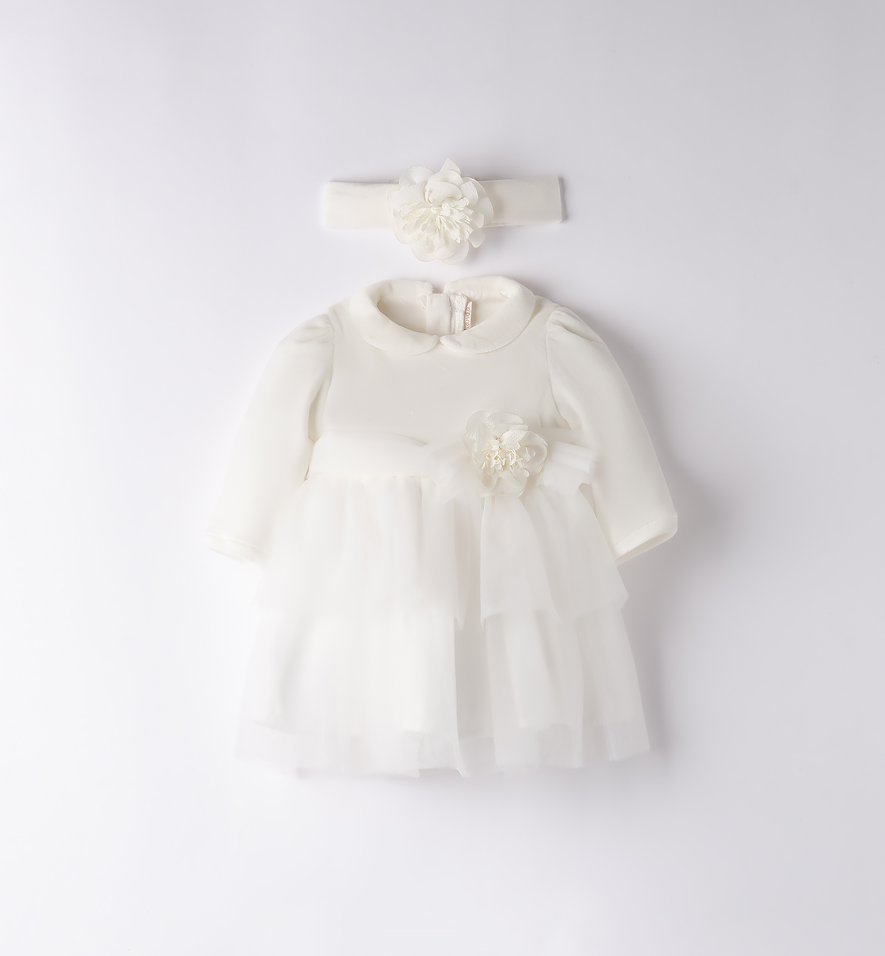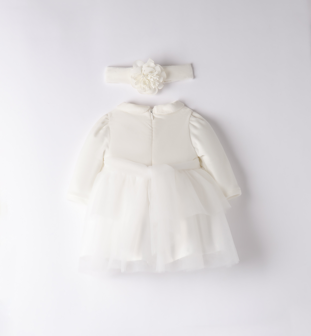 Abito cerimonia neonata in velluto e gonna in tulle con fiori applicati e fascetta abbinata